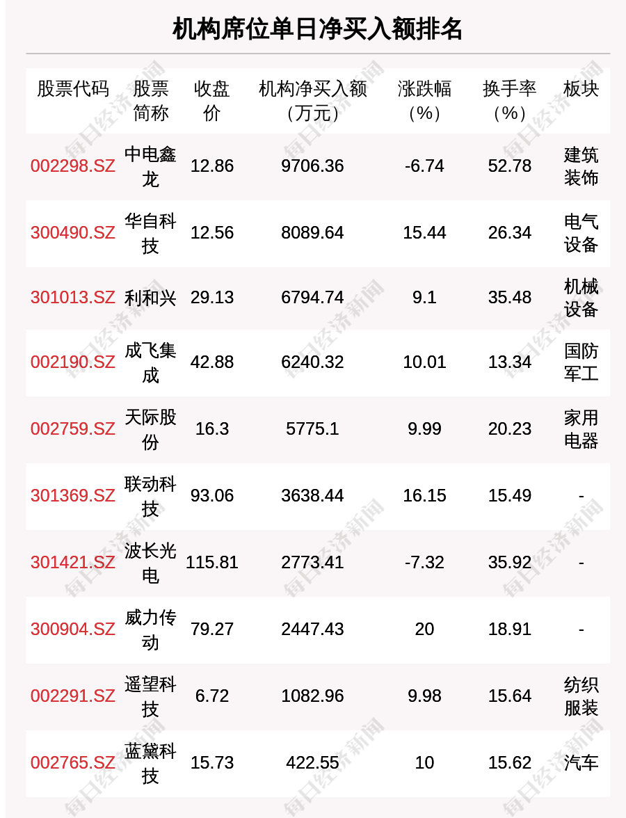 在龍虎榜中,涉及機(jī)構(gòu)專用席位的個(gè)股有21只,凈買入額前三的是中電鑫龍、華自科技、利和興,分別為9706.36萬(wàn)元、8089.64萬(wàn)元、6794.74萬(wàn)元。