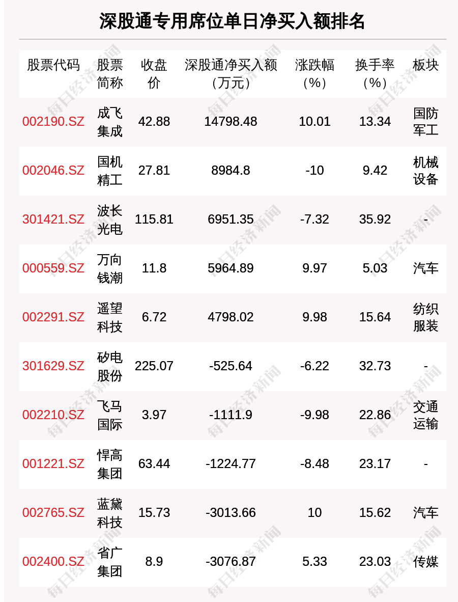 在龍虎榜中,涉及深股通專用席位的個(gè)股有12只,成飛集成的深股通專用席位凈買入額最大,凈買入1.48億元。