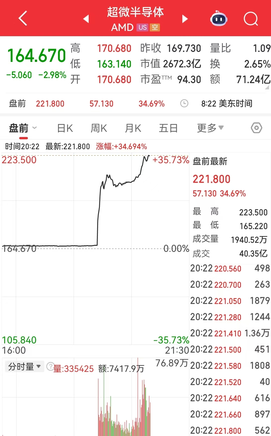 當地時間10月5日,美股盤前,超微半導體(AMD)大漲35%。