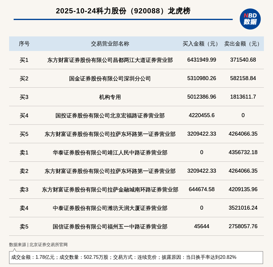 每經(jīng)訊,2025年10月24日,北交所上市公司科力股份(920088,收盤價:35.05元)登上龍虎榜,交易方式是連續(xù)競價,披露原因是當日換手率達到20.82%,成交數(shù)量502.75萬股,成交金額1.78億元。買一席位為東方財富證券股份有限公司昌都兩江大道證券營業(yè)部,買入643.19萬元;賣一席位為華泰證券股份有限公司靖江人民中路證券營業(yè)部,賣出435.67萬元。