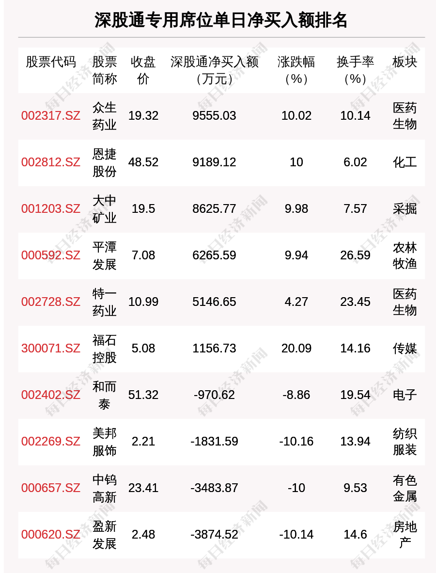 在龍虎榜中,涉及深股通專用席位的個(gè)股有10只,眾生藥業(yè)的深股通專用席位凈買入額最大,凈買入9555.03萬元。