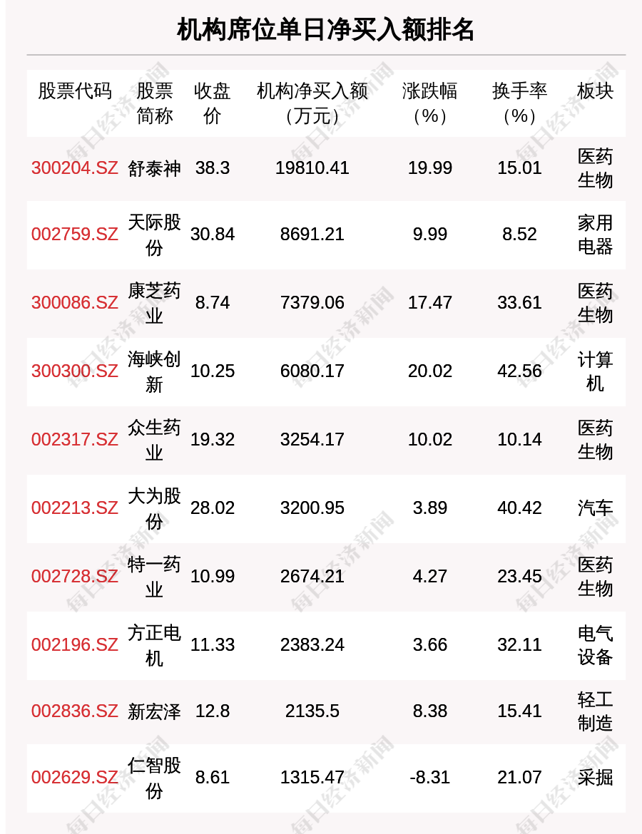 在龍虎榜中,涉及機(jī)構(gòu)專用席位的個(gè)股有26只,凈買入額前三的是舒泰神、天際股份、康芝藥業(yè),分別為1.98億元、8691.21萬元、7379.06萬元。