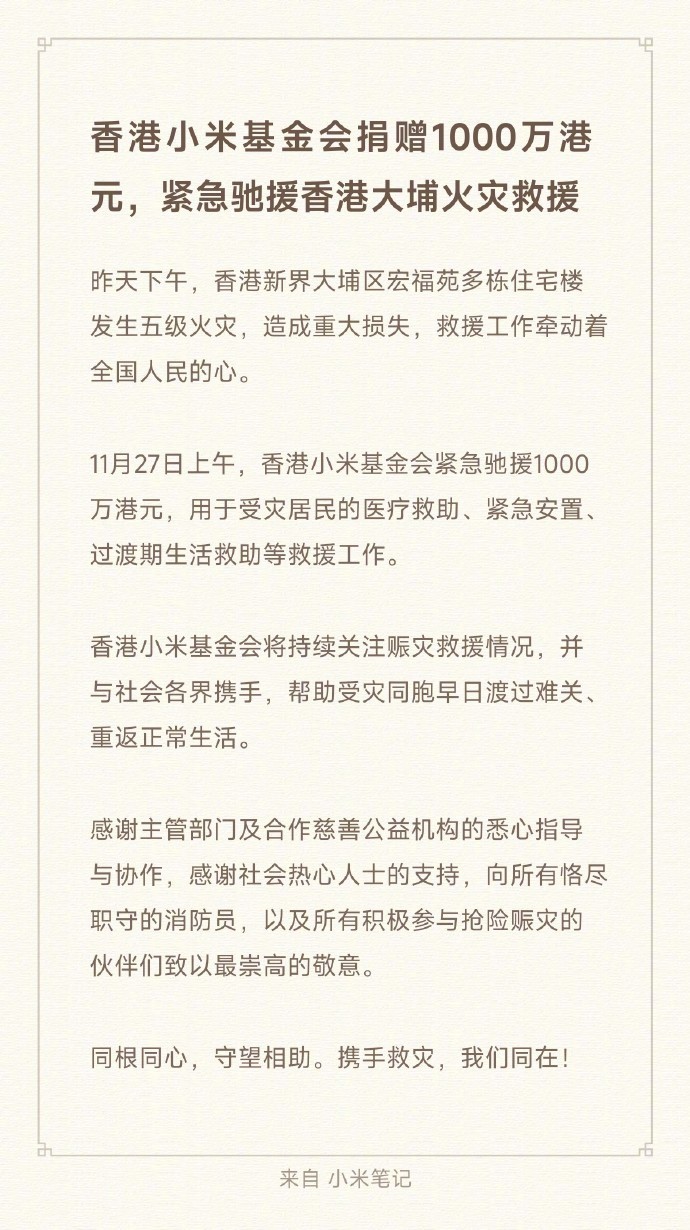 11月27日,雷軍發(fā)文表示,香港小米基金會捐贈1000萬港元,緊急馳援香港大埔火災救援。祈愿逝者安息、傷者康復,受災同胞早日渡過難關。