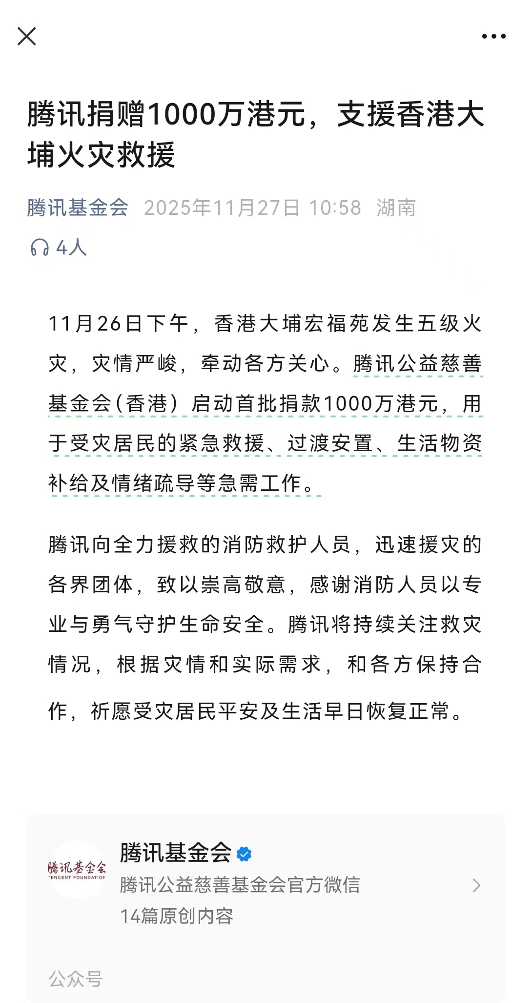 騰訊公益慈善基金會(香港)啟動首批捐款1000萬港元,用于受災居民的緊急救援、過渡安置、生活物資補給及情緒疏導等急需工作。