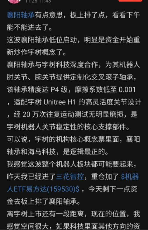 次日(11月28日)上午,襄陽(yáng)軸承在沒(méi)有明顯利好的情況下,突然直線漲停。上述事件迅速在各社交媒體間引起不少關(guān)注。